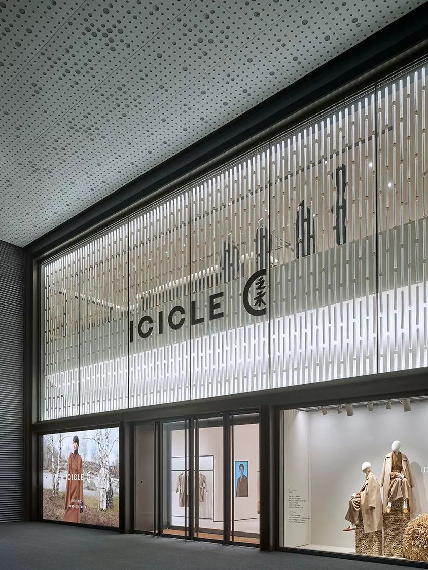 A special feature of the shop facade is its clear structure. The frame and structure have been kept to a minimum and, similar to the typical ICICLE styling, can be seen as an understatement. The overall concept underlying the facade design focuses on reduction, transparency, and uniformity of materials. Above the entrance area is a curtain of 800 hand-made white porcelain tubes reaching all the way to the upper floor. The architects have chosen ceramics, a natural material, as the main element that forms a contrast to the dark gray metal profiles of the shop window front. The gaps in the curtain allow views from the ICICLE Space to the city and vice versa.