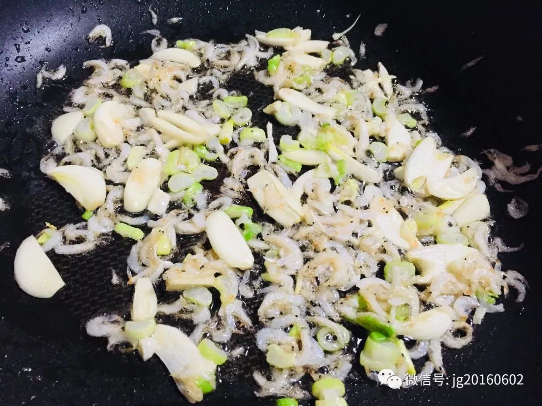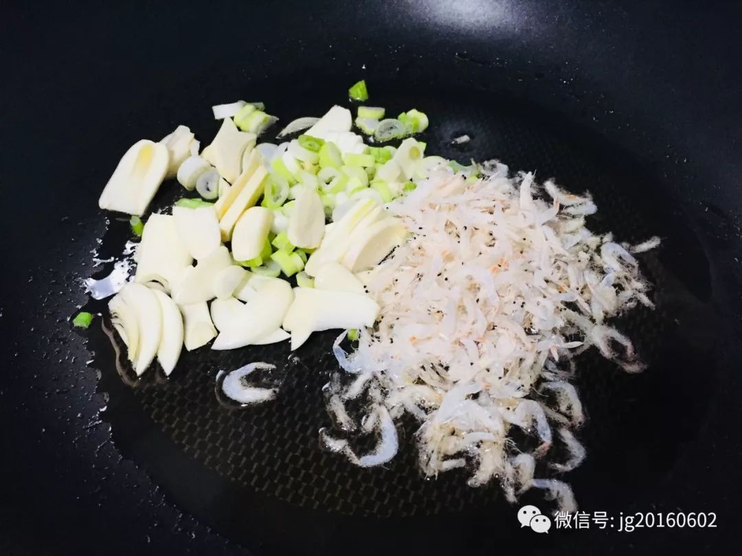 炒锅中放入适量食用油,油温五成热时放入备好的葱花、蒜片、虾皮;