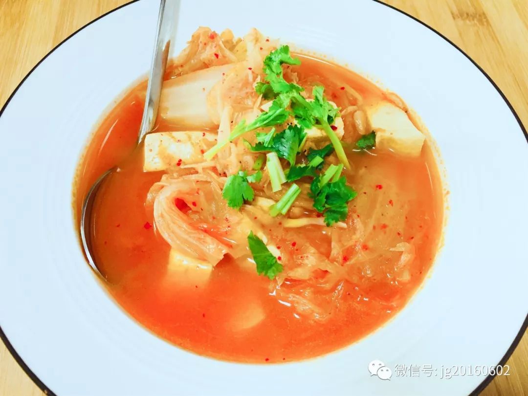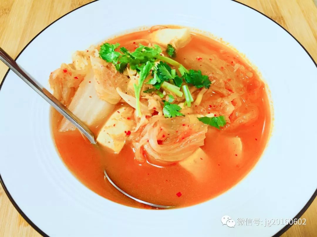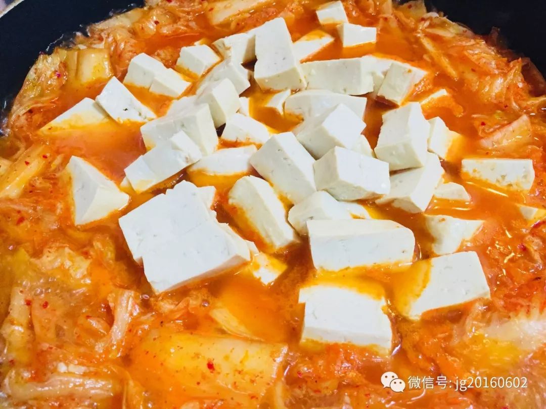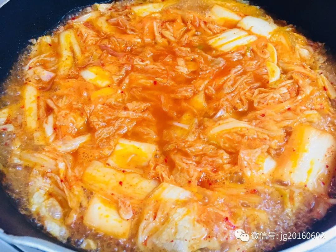 甜辣的韩式泡菜,加上水嫩的豆腐,小火慢熬,辣白菜的香甜鲜辣味儿全部进入汤汁里,弥漫于厨房之间,口水止不住啊!你完全可以想到,用汤汁泡饭,那真是没话说啊!