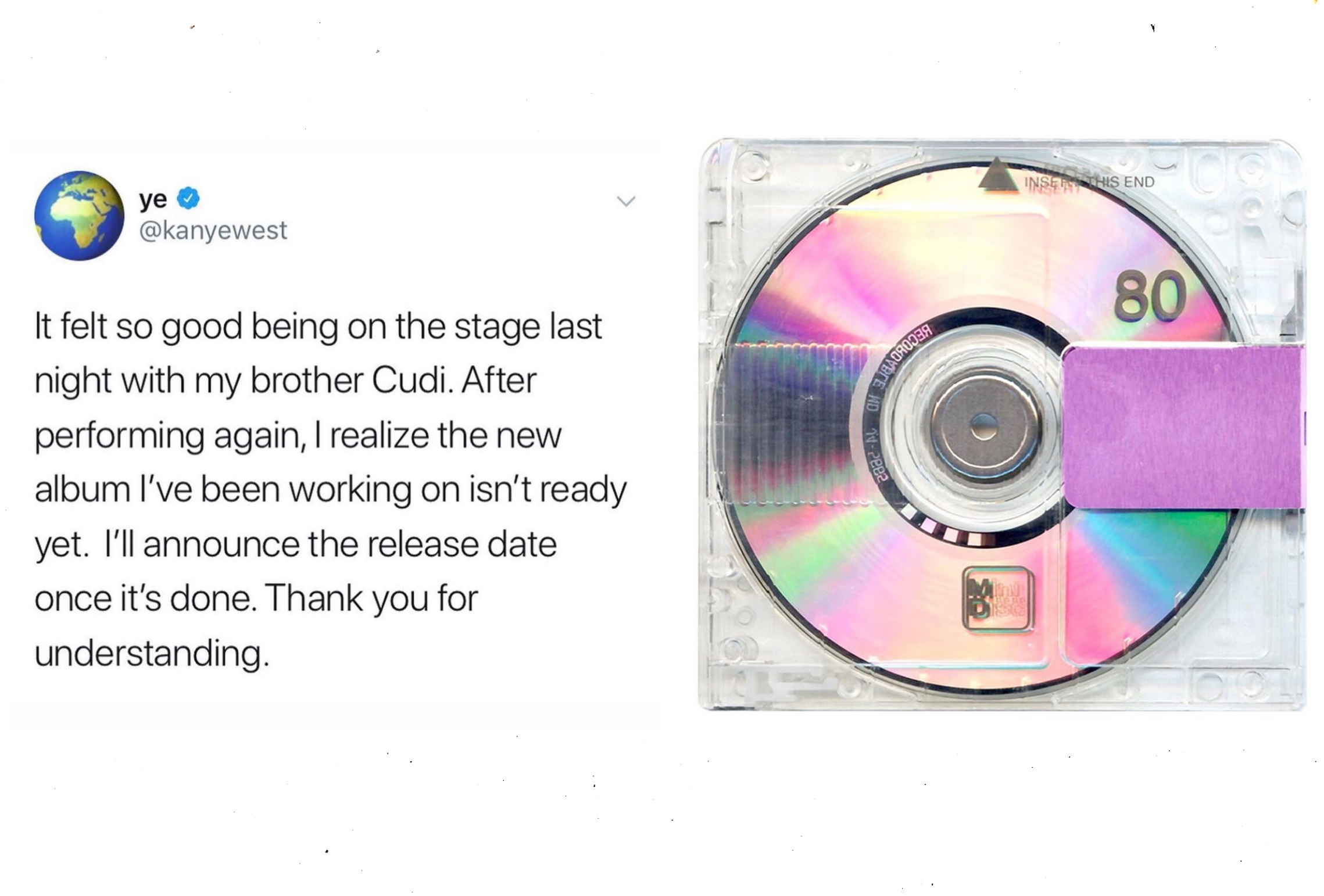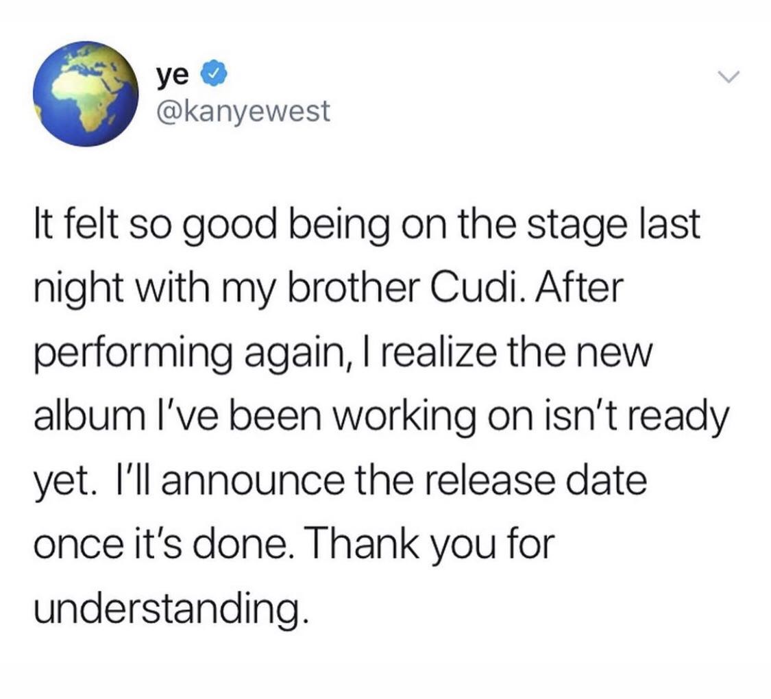 侃爷 Kanye West 的新专辑《YANDHI》本来预计是在 2018 年的 9 月 29 日发行,但却因为不可抗拒力一直推后。期间妻子卡戴珊为了安慰粉丝,带来了延期到去年的“黑色星期五”发行的消息,但等到了 11 月专辑依旧不见踪影。继续苦等半年,到了今年五月份,侃爷自己也坐不住了,发推表示和好兄弟 Kid Cudi 再度同台演出之后,觉得一直努力创作的新专辑还不够完美。并表示当专辑完工的时候会将亲自再次宣布发行日期并感谢大家的理解。从去年九月等到现在,还未知今年九月可否发行,在心疼侃爷歌迷的同时,小编也想帮大家喊出一句:侃爷别搞时尚了,看看新专辑吧!