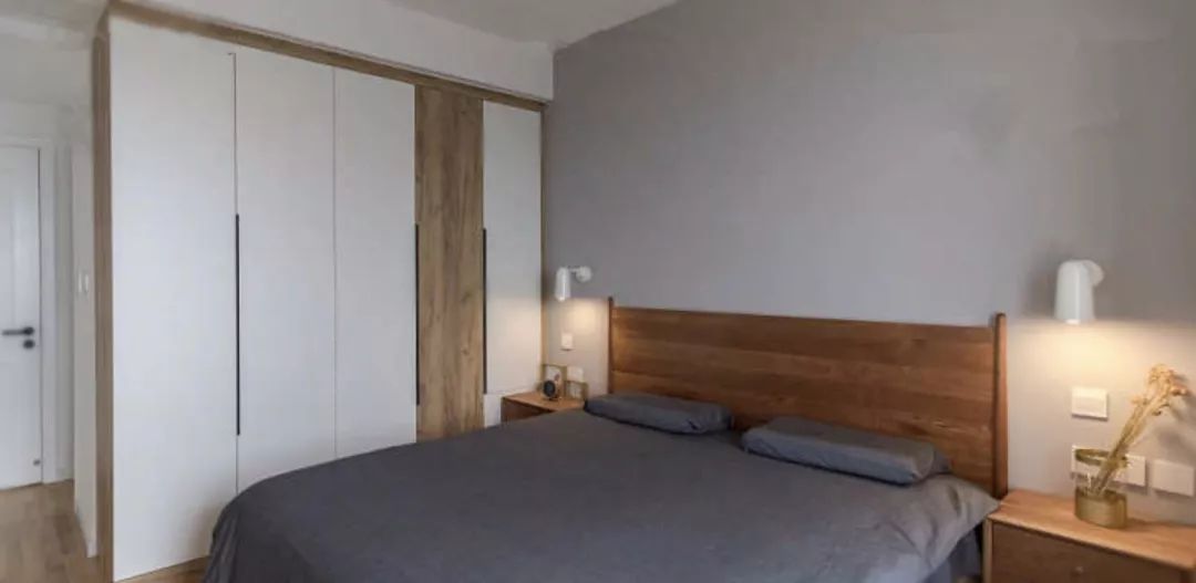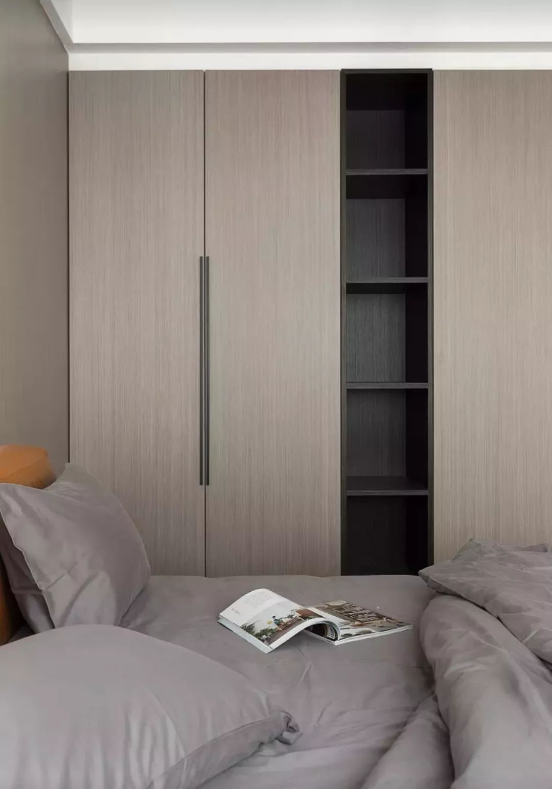 撞色衣柜,比较简单的做法就是在衣柜门里加入一块与整体衣柜不同颜色的柜板,结合整体软装布置,营造出一个优雅舒适的层次美感。