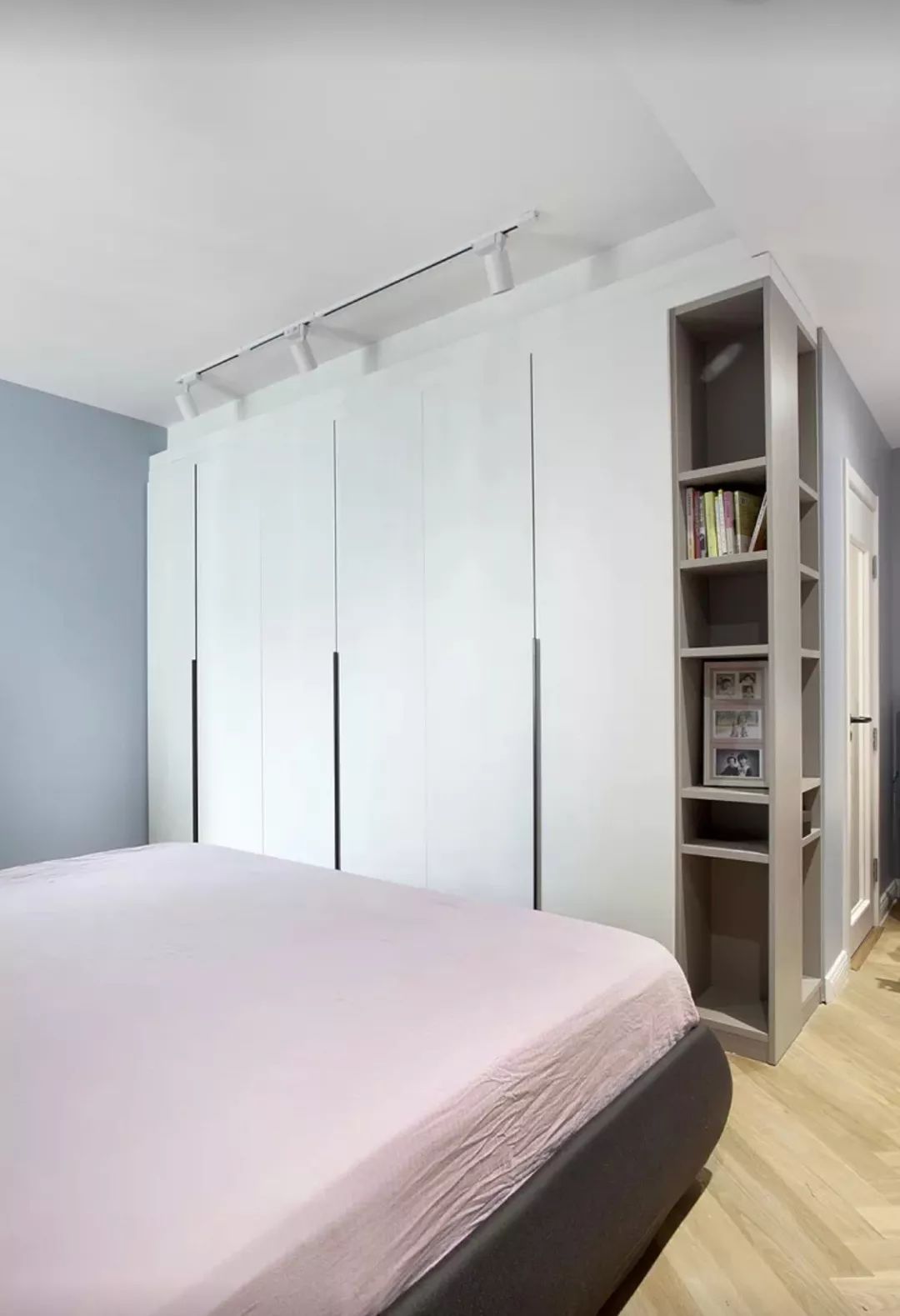 如果衣柜足够大,也可以考虑在衣柜里加入一个开放的格架,与衣柜主体不同颜色的格架,并把格架作为存放展示品的位置,整体空间会显得宽敞舒适而又有层次。
