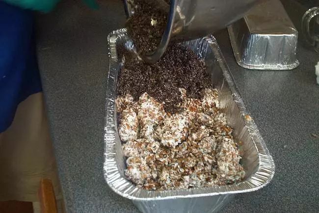 之后就可以用杀菌消毒后的盆栽土覆盖基底,只需要薄薄的一层即可,不能覆盖太多,用水分少点喷洒整个混合物,让它彻底湿润,用湿润的毛巾覆盖整个容器,防止水分流失。