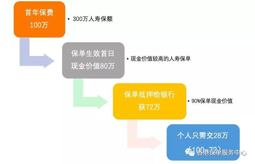 举个例子,首年保费100万,保单首日现金价值80万,保单抵押给银行或72万融资,个人只需付款28万。