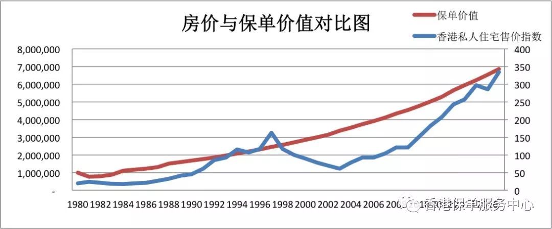 比较可见,保单的价值增长速度一点都不逊色于房价。而且,房屋售价指数是按照香港整体房屋的交易均价,并没有考虑单个房屋的折旧贬值。