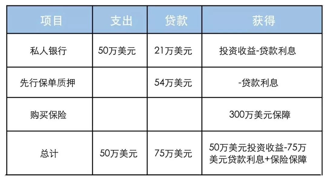 实际操作中投保人可在香港某银行存入一笔50万美元购买银行指定的理财产品,并将产品质押给银行再融资,即可按照资产价值的50%获得25万美元的贷款,加上此前保单在缴费之前先行的保单质押融资获得的54万美元,即可缴纳大额保单的保费。
