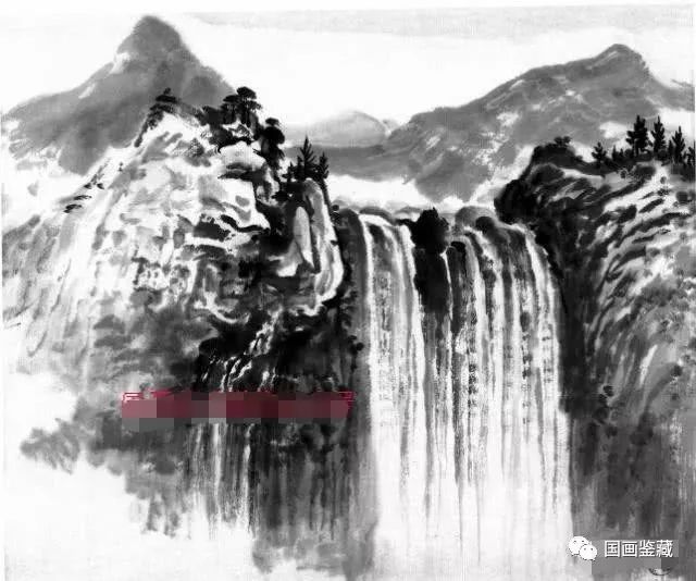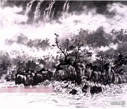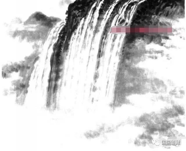 此图为瀑布构图,此种构图上重下轻,上实下虚,动静有势,黑白调和。画时,瀑水上口宜紧,上口紧则流势猛。瀑布应画出厚度,使之有立体感,有厚度,气势方大,否则便会显得平薄刻板。瀑周之云须虚中有实,墨色亦湿润浅淡,形象须自然生动,不能有雕琢、刻板之状。