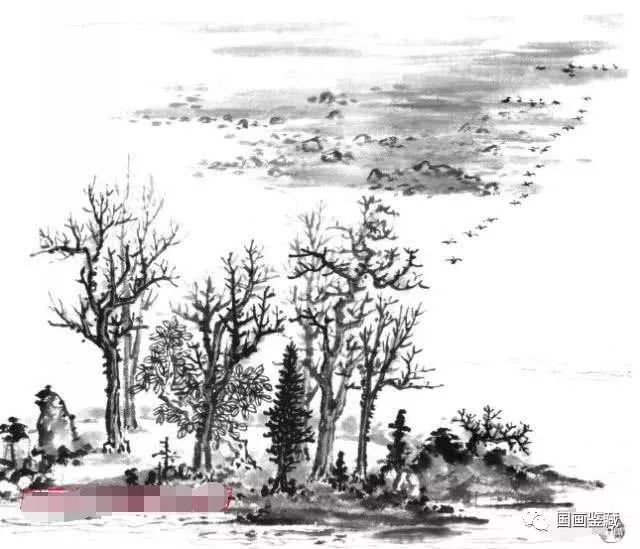 近景之树虽画成横排,但由于变化其高低偃仰姿态,间以夹叶树,并不觉板。图中只画一行飞雁斜行,便将远近景联系起来。