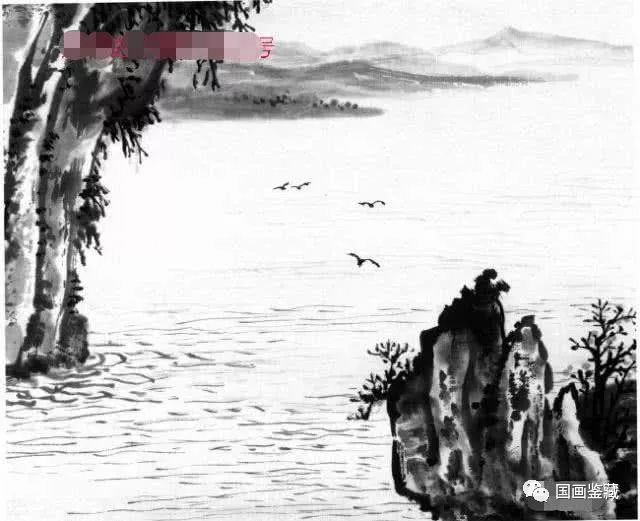 此图为静态构图,故笔触须简,远山静中略着飞鸟以破寂寥,生静中有动之趣。画得淡而平扁,使湖面显得宽阔。近处峰、礁呼应。