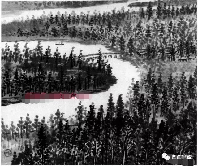 园林构图。林中树木极多,欲皆细画,则显得杂乱。图中只将近处十几株画得略为具体,余者从简,越远越简而淡,最远处以点代之。树林中画有屋舍,以示为护林居处。为不使满纸皆树,中以河水绕流。因林中有水,反面增加树木繁茂之状。