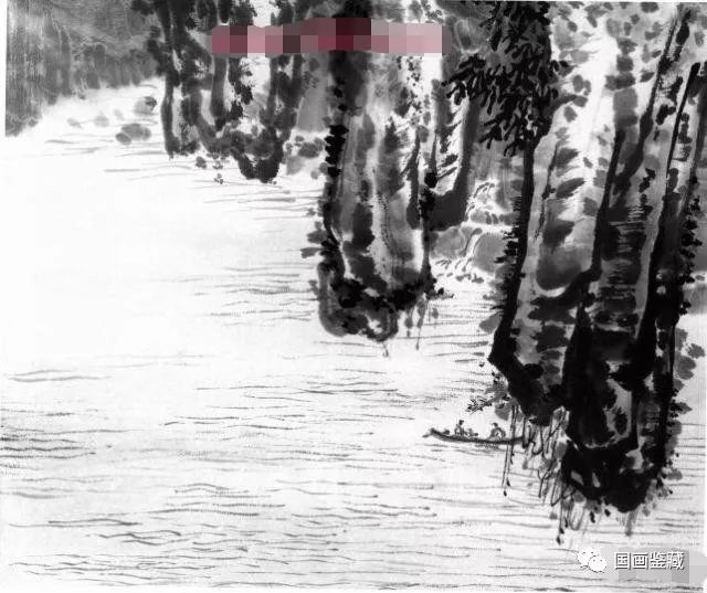 垂岩构图。画面中虽无整个峰岩,但山峰上下、前后气势连贯,下垂之岩须分远近。垂岩间画有远方的泉水加以调节。更远处画石滩,增加画面深度。垂岩上面有杂树树枝叶和垂藤、苔点,可免岩石光滑之弊。垂岩下端切忌画得齐平,以免与水中矗峰相区别。垂岩下增画小船游人,以赏奇景。
