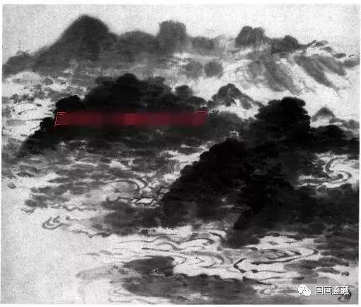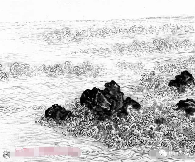 此图为潮水画法,必须刻画出水流奔腾气势。近处画有礁石,经潮水冲撞,浪花飞溅,显得分外汹涌。画波纹须近大远小,波纹墨色不宜画深,但淡中亦要分出深浅,以示波纹有前有后,明礁附近常画有漩涡,以示水下有暗礁存在。画明礁要有安如泰山之感,并有翻滚浪花,一动一静对比,动静有势。