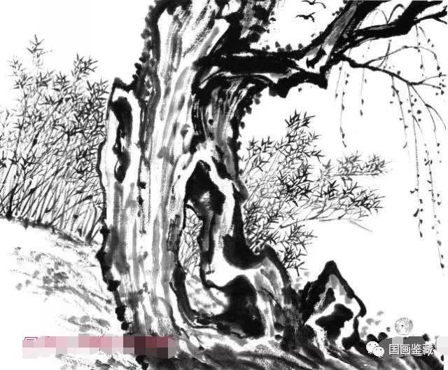 此图取古柳树,着意刻写其苍劲挺拔之态。因树龄已高,树身有洞,更觉古拙奇曲。古柳右上角老枝生发新枝,枝条哇絮,古柳坡旁长有新篁,劲、柔、巧、拙,对比之下,予人以枯木逢春之印象。
