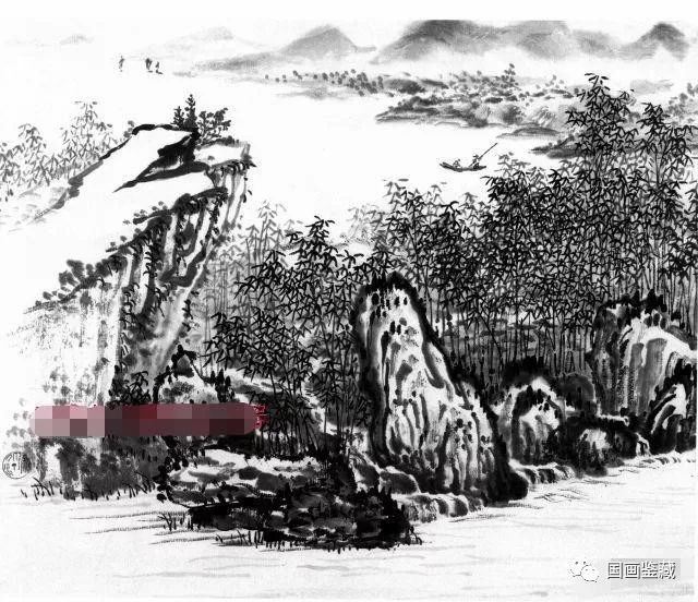 近景画竹林曲水。为表现丛竹繁茂,画得较为密集,而山石勾皴则要简练,以求繁简适中。近处石块土层较厚,须用湿笔渲染,使之厚润,左边高坡土质较少,则用干笔皴,干湿、明暗形成对照。