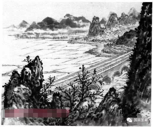 长渠构图。田间长渠贯穿于两山之间,为避免长平板直而取斜向,同时以树梢作为渠道直线的破笔。渠底画有孔道,孔道左右画有田亩,使之区别于桥。田亩埂线要浅,笔断意连,方不显板。远田无埂,更显得田野宽广。