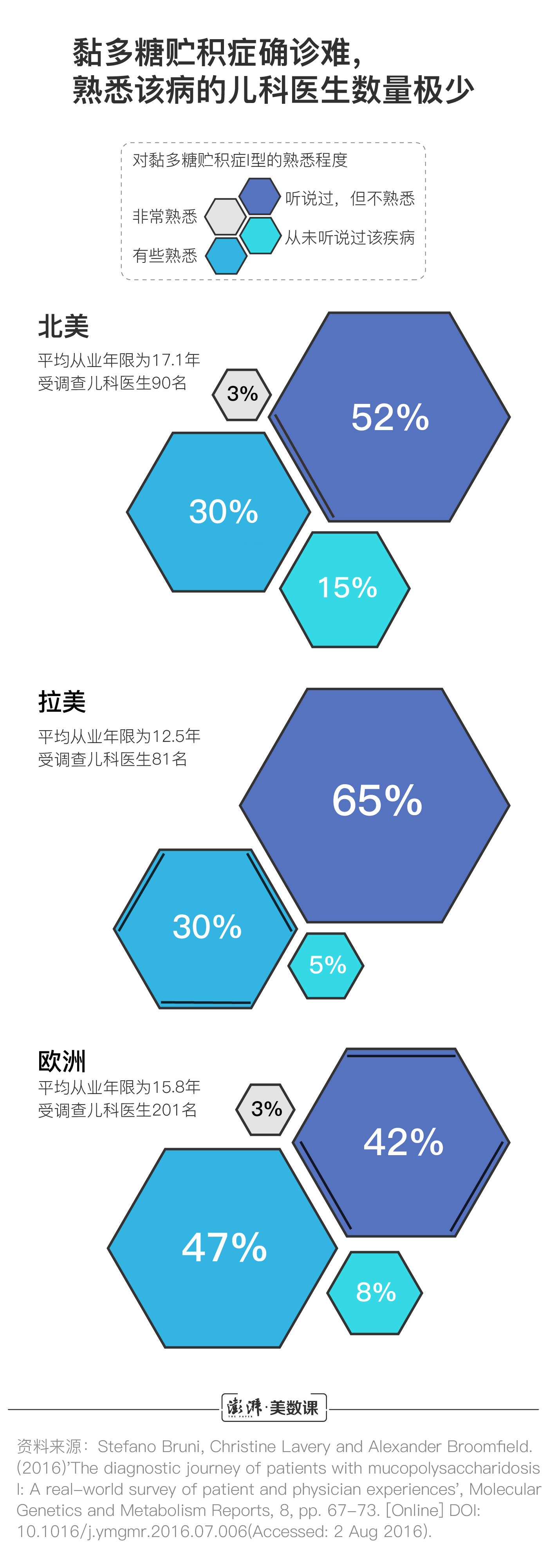 多数患者在幼儿期或儿童期就已发病,儿科是他们均会前往就医的科室之一。但根据欧美学者2016年时发布的调查数据显示,即便在北美和欧洲,对于黏多糖贮积症中患病率较高的I型,熟悉它的儿科医生数量也极少。