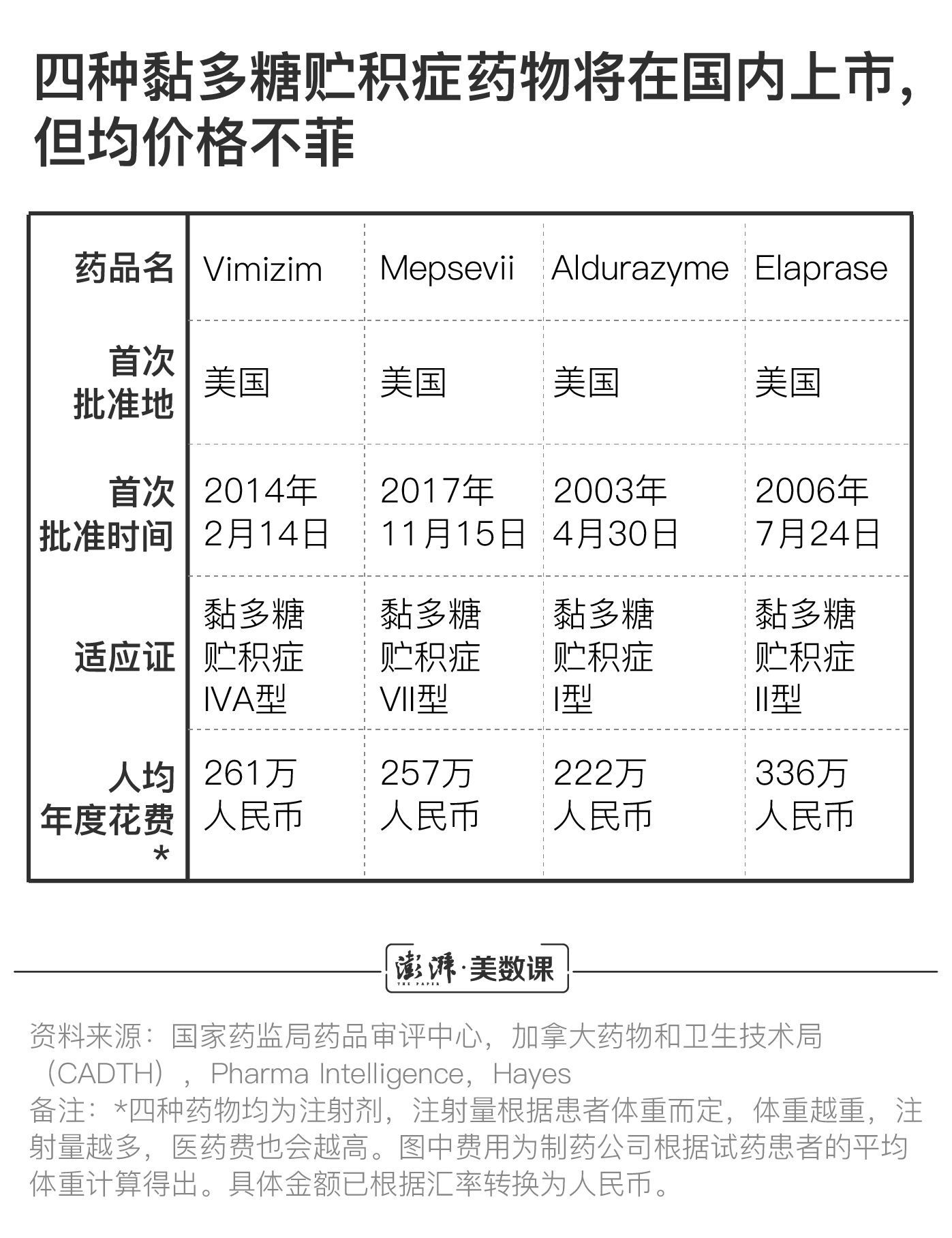 对于黏多糖贮积症患者而言,更积极的改变出现在去年11月和今年3月。国家药监局药品审评中心发布了两批“境外已上市临床急需新药名单”,计划加快审批这些药物在国内的上市,以满足罕见病治疗的需求;其中包括四种黏多糖贮积症药物,分别对应四种病型。
