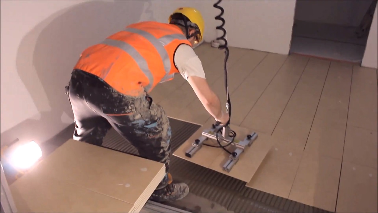 之后可以将吸附器拉下,吸上一块瓷砖,然后手扶着这个装备将瓷砖放置到已经涂抹好水泥的地面上,