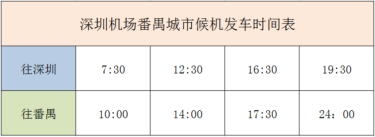 这个班次是暂定的,后期会根据客流需求进行调整,全程行驶60分钟左右。开业第一个月,针对番禺市民还有一定的优惠。在深圳宝安国际机场的上下车点设置在二楼到达层16号门外的10号停车卡位。