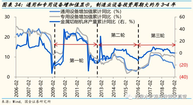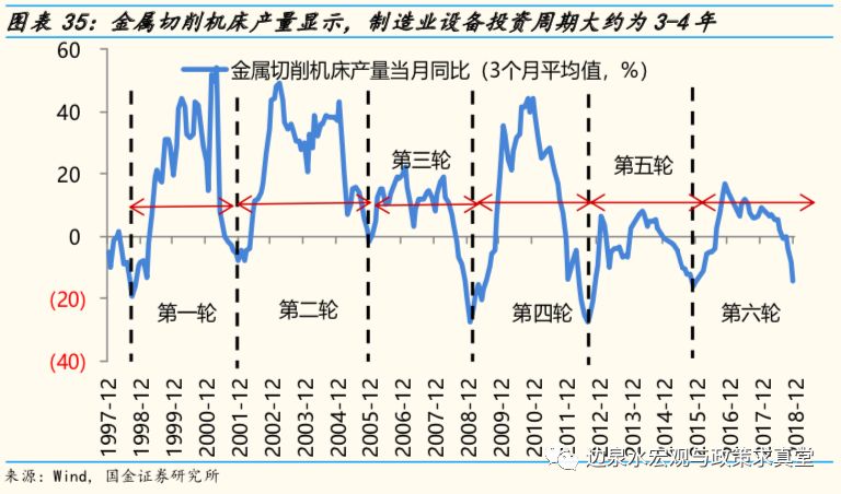 从历史数据来看,制造业设备投资周期的时间长度大约为3-4年时间,而非通常意义上的8-10年时间。制造业投资是围绕着设备投资展开的。前面已经分析过,制造业设备投资主要来自于通用和专用设备制造业,因此通用和专用设备增加值能够很好地跟踪制造业投资。设备存在一定的使用以及更新周期,每轮设备更新将会带动制造业投资上升,因此设备投资周期至关重要。然而,制造业行业过多,每个行业的更新周期都不太一样,导致整个制造业行业的设备投资周期的时间长度并不确切。很多人认为,设备投资周期大约为8-10年时间,因为大部分的机械使用年限就是8-10年左右。不过,这可能仅仅是理论上的猜测。实际上,通过观察通用和专用设备增加值同比的变化,我国的设备投资周期大约为3-4年时间。2009年以来,制造业共计经历了2轮完整的设备投资周期,分别是2009.02-2012.09(3年3个季度)、2012.10-2015.12(3年1个季度)。当然,3-4年设备投资周期的判断受到两个方面的挑战:一是公布通用和专用工业增加值同比的时间较短,且2009年过于特殊,可能在其他时间并不遵循3-4年的判断;二是通用和专用设备工业增加值同比的波动可能来自于企业库存的变动,而非真正的设备投资变动。解决第一个问题,我们采用时间更长的金属切削机床产量进一步判断时间段。前面已经分析金融切割机床是通用设备的典型设备。从实际数据来看,金属切削机床产量累计同比与通用、专用工业增加值累计同比走势基本一致。我们发现,1998年以来,金属切削机床经历过五轮完整的周期,每轮周期大约为3-4年,分别是1998.11-2001.12(3年2个月)、2002.01-2005.12(4年)、2006.01-2008.12(3年)、2009.01-2012.09(3年3个季度)、2012.10-2015.12(3年1个季度)。解决第二个问题,我们采用金属加工机床进口金额进行验证。金属加工机床进口金额代表着终端需求,而非用于增加库存。从历年数据来看,金属切割机床产量与金属加工机床累计同比的走势是比较接近的,这表明两者都受到共同的设备投资需求的影响。不过,由于从海外预订机床,到生产机床,再到运输到国内,需要耗费一定的时间,两者之间存在着时间差。金属切割机床产量累计同比大约领先金属加工机床进口金额累计同比6个月。