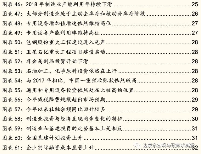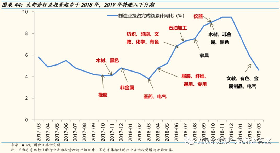 3、回顾与展望:此轮制造业投资增速高点已过,2019年处于下行阶段。此轮制造业利润复苏始于2016年,按照历史经验,2017年制造业投资应该出现明显回升。然而,受供给侧改革影响,制造业投资从2018年才开始显著回升。此轮制造业投资回升的特点是石油加工、黑色冶炼、非金属制品等传统制造业利润明显改善,随后,产业结构升级、技改投资增加,推动制造业投资增速上行。展望2019年,利润下滑将导致制造业投资中枢下移。从2年的建设时长来看,2019年大部分行业投资进入尾声(例如非金属制品、有色冶炼等),制造业投资进入下行期。2018年大部分行业经营状况转弱,包括利润总额同比下滑、库存周期处于被动去库存阶段、产能利用率下滑,进一步验证制造业投资将下行的趋势。不过,专用设备工业增加值增速和产能利用率均处在非常高的水平,石油加工、化学原料行业产能置换仍有空间,表明产业结构升级并未完全结束,会对制造业投资形成支撑,制造业投资下行斜率不会太陡。减税降费以及宽信用政策会对制造业投资带来正向影响,但难以完全对冲制造业投资的下行趋势。我们判断,2019年制造业投资增速下行方向是确定性的,但是,由于3月已经下降到非常低的水平,进一步大幅下滑的空间有限,预计全年制造业投资增速为3-5%。