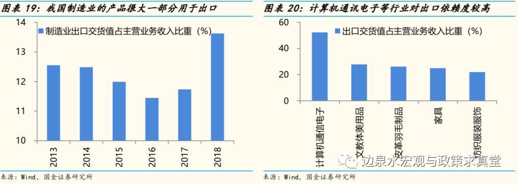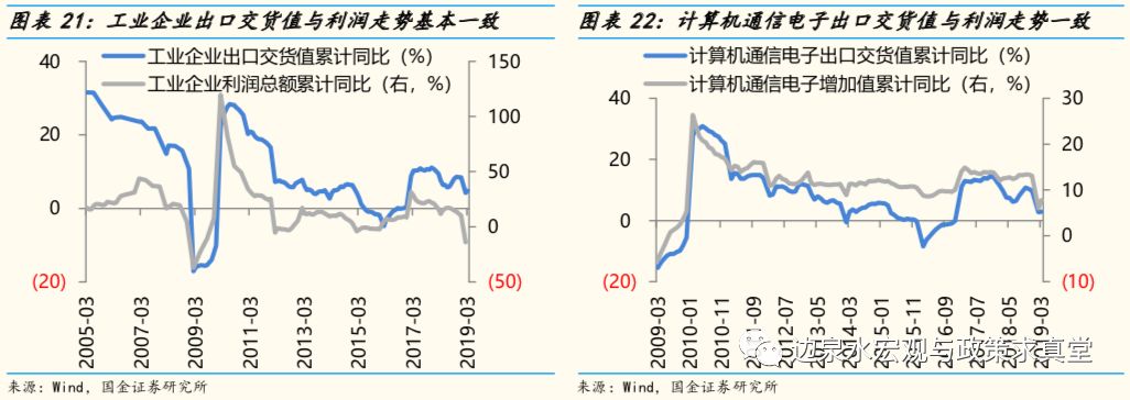 出口是跟踪海外需求的较好指标。我国制造业产品中很大一部分用于出口。2018年制造业出口交货值占主营业务收入的比重为13.6%,出口的行业内部结构并不平衡。计算机通讯电子、文教体美用品、皮革羽毛制品、家具、纺织服装服饰五个行业的出口占其主营业务的比重是非常高的。以2018年为例,计算机通讯电子、文教体美用品、皮革羽毛制品、家具、纺织服装服饰五个行业的出口交货值占主营业务收入的比重分别为52.3%、27.8%、26.1%、25.0%和22.0%。从数据上看,工业企业出口交货值累计同比与工业企业利润是同步指标,这表明我国工业企业利润其实与海外经济环境密切相关。