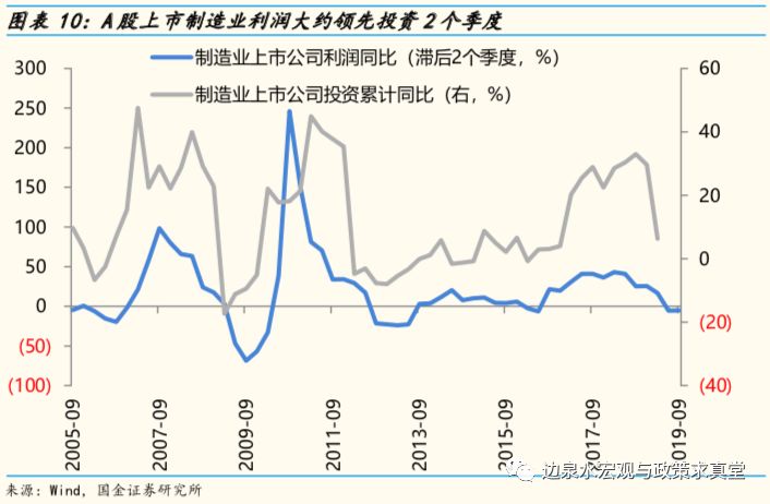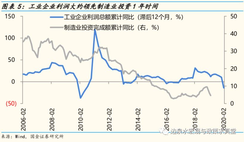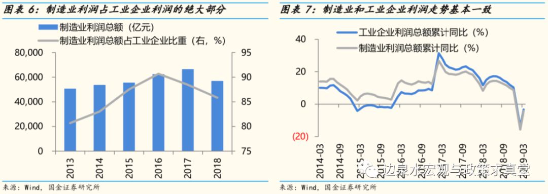 从历史数据来看,工业企业利润累计同比一般领先制造业投资累计同比1年左右的时间。需要说明的是,在分析的过程中,我们采用工业企业利润累计同比,而不是制造业企业利润累计同比,原因在于我们获得的制造业企业数据的时间是从2014年开始的,时间比较短,无法有效地分析历年来制造业企业利润与投资之间的关系。工业企业利润累计同比是制造业利润累计同比的一个非常好的替代指标。原因主要有两个方面:一是制造业利润占工业企业利润的绝大部分。工业主要包括采矿业、制造业和电力热力燃气水生产供应业,其中制造业占据工业生产的绝大部分,因此制造业利润也占据工业企业利润绝大部分。2014-2018年制造业企业占工业企业利润的比重均值为86.0%。二是制造业企业和工业企业利润走势基本上是一致的。制造业生产过程中需要原材料,进而拉动采矿业、电力热力燃气水生产供应业生产发生变化,因此,采矿业、制造业和电力热力燃气水生产供应业的生产是联动的,进而带来利润的共同变化。2014年以来,制造业和工业企业利润累计同比变化的方向以及幅度基本上是一致的。因此,我们采用工业企业利润累计同比替代制造业利润累计同比。