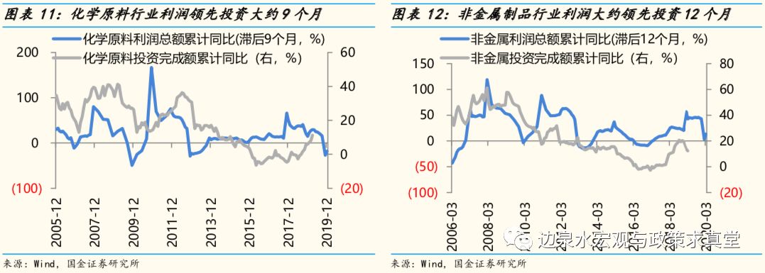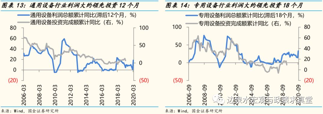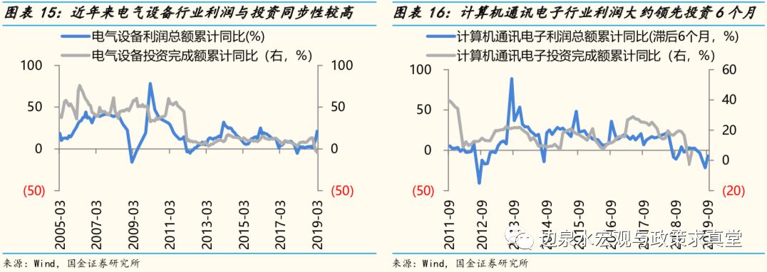 从行业层面来看,利润是投资的领先指标,但不同行业的利润对投资的领先程度不同;整体而言,各行业制造业利润领先投资12个月左右的时间。由于制造业行业过多,我们无法将所有制造业行业利润与投资的数据都展示出来。我们选择性地展示了2017年投资完成额占比较高的六个行业,分别为化学原料及化学制品制造业、非金属矿物制品业、通用设备制造业、专用设备制造业、电气机械及器材制造业、计算机通信和其他电子设备制造业。从行业层面来看,利润是投资的领先指标,不过不同行业利润对投资的领先程度。例如,化学原料及化学制品制造业利润累计同比大约领先投资9个月,然而专用设备制造业利润领先投资大约18个月。整体来看,各行业制造业利润领先投资12个月左右的时间。