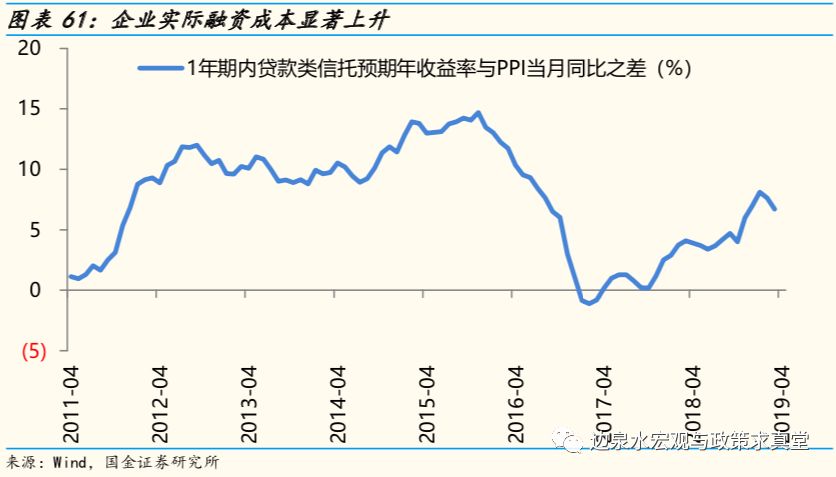 国内外经济放缓,企业实际融资成本上升,货币政策依然需要保持边际宽松。未来政策重心将从化解企业融资难转向融资贵问题,预计年内再次降准2次,降低OMO、MLF等政策利率、降低存贷款基础利率的概率依然存在。制造业投资和海外需求放缓,今年我国经济将会走弱,叠加全球经济下滑,PPI将会下行,下半年甚至可能转负。在此背景下,制造业的实际融资成本将会显著上升。我们采用1年期内贷款类信托预期收益率与PPI当月同比之差表示制造业实际融资成本。2019年1季度实际融资成本上升至8.1%,达到2016年4季度以来的最高水平。未来看,PPI将会下行,实际融资成本仍将维持在较高位置,甚至继续上升。实际融资成本高,企业负担显著加重,今年货币政策的重心将从化解企业融资难转向融资贵问题,货币政策是比较宽松的。今年货币政策放松将会体现在两个方面:一是多次降准,预计年内再降准2次。为了维持正常的信用扩张以及存款增长,以及应对经济下行以提振市场信心,今年需要多次降准,预计年内再降准2次。二是降低OMO、MLF等政策利率、不排除降低贷款基础利率的可能性。下调利率在结构上将会与以往存在很大的不同。近年来,我国不断推进利率市场化,OMO、MLF等政策利率在货币政策传导机制中的作用越来越大,存贷款基础利率的使用开始变少。2016年以来,PPI持续回升,央行并未调高存贷款基础利率,而是调高了OMO、MLF等政策利率。我们判断,央行将会下调OMO、MLF等政策利率。不过,我们认为,不排除降低贷款基础利率的可能性。虽然央行希望政策利率在货币政策传导机制中发挥重要作用,然而,政策利率向货币市场、债券市场传导是通畅的,然而向信贷市场传导依然有所阻滞。在政策利率向信贷市场传导机制打通之前,贷款基础利率依然对金融机构的贷款利率具有重要影响。