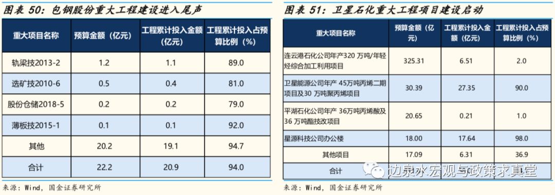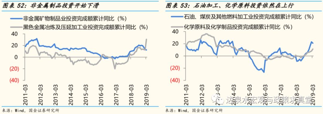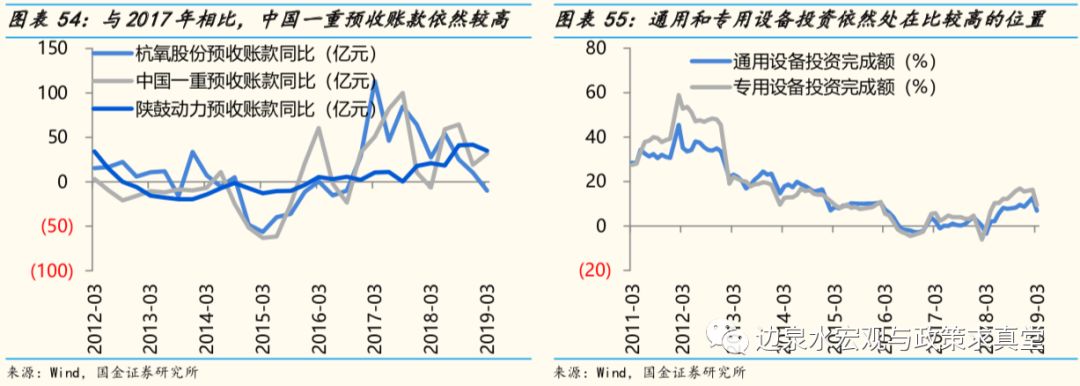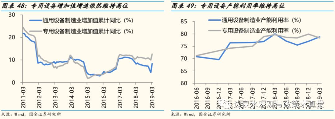 从行业来看,非金属制品、黑色冶炼行业的投资正在减弱,但石油加工、化学原料行业的投资正处于释放阶段,且通用和专用设备投资不算差。前面已经提及,本轮制造业的特征是,传统制造业利润改善带来产业结构升级。传统制造业投资的进度并不是一致的,非金属制品、黑色冶炼设备更新较快,然而石油加工、化学原料设备投资稍慢。2016-2017年非金属制品、黑色冶炼行业利润大幅改善,两者的投资于2017下半年年便已启动,2018年投资增速明显提升,在2018年3季度时候达到最高增速,现在已经渡过了最快的投资期,正处于高位缓慢下滑阶段。以代表性公司包钢股份为例,大部分重点工程项目都将结束了。虽然3月黑色冶炼投资回升较多,但是我们判断向下的趋势没有改变。从2016年开始,石油化工、化学原料行业利润便明显改善,但是投资从2018年3季度才开始起步,大练化、丙烷裂解制乙烯等重大工程进入集中建设阶段。按照2年的建设时长估算,2019年将进入投资快速上行期。以代表性上市公司卫星石化为例,300亿级的轻烃综合加工利用项目才刚刚启动。从整个行业来看,2019年3月石油加工、化学原料投资完成额累计同比为21%和11.3%,分别比2018年高出10.9和5.3个百分点。设备类上市公司的数据可以做进一步的验证。石油加工、化学原料行业所需要的设备主要是锻焊加氢反应器、空分设备、压缩机等大型机械设备,这些大型设备需要提前预定。中国一重、杭氧股份、陕鼓动力是化工设备的典型代表公司,它们的预收账款基本上可以代表着设备的需求状况。2017年以来,中国一重、杭氧股份、陕鼓动力的预收账款增速都处在非常高的水平,目前除了杭氧股份以外,中国一重、陕鼓动力的预收账款增速依然非常高。此外,设备需求增加带动通用和专用设备利润改善,通用和专用设备投资高于整体制造业投资,高增速应该还会延续一段时间。