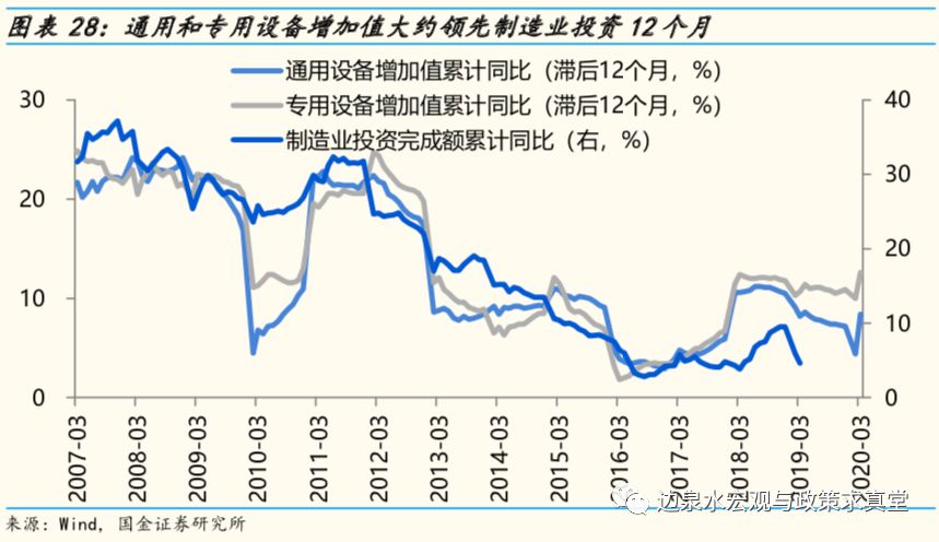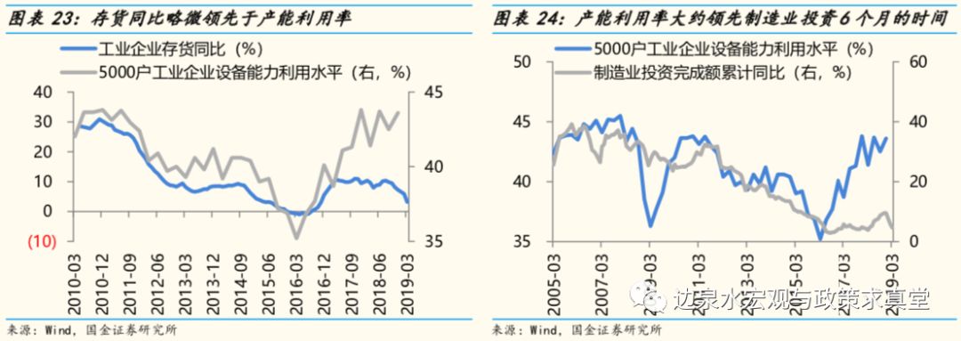 需求改善以后,还应当看到两个现象:一是企业生产增加,存货相应上升;二是更多的设备投入生产,生产设备利用率上升,或者产能利用率上升。从数据表现上看,存货同比略微领先于产能利用率。当产能利用率回升到一定程度以后,如果企业的设备逐渐不够用于生产,企业将会开始扩张产能。从数据上看,产能利用率大约领先制造业投资6个月的时间。