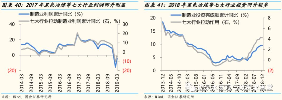 石油加工、黑色冶炼等传统制造业利润改善、投资增加,是制造业投资回升的直接原因。我们在《中国PPI下行,全球央行逐渐进入降息通道——中国PPI对我国与全球经济和政策信号作用的分析》专题报告中提出,PPI主要受到煤炭开采、石油开采、农副食品、石油加工、化学原料、非金属制品、黑色冶炼、有色冶炼八大行业影响。制造业中石油加工、化学原料、非金属制品、黑色冶炼、有色冶炼五大行业受周期性影响,波动很大,历次PPI上升过程中,利润改善幅度也是最大的。这五大行业利润改善以后,对设备需求会明显增加,进而带动通用设备、专用设备生产、利润、投资等相应增加。为了行文方便,我们将石油加工、化学原料、非金属制品、黑色冶炼、有色冶炼、通用设备、专用设备统称为七大行业。2016年和2017年制造业利润分别较上一年回升9.5和5.9个百分点,而七大行业拉动制造业利润回升7.7和5.8个百分点。2017年和2018年制造业投资分别较上一年回升0.6和4.7个百分点,而七大行业拉动制造业投资回升0.7和4.6个百分点。由此可见,此轮制造业利润回升主要受到七大行业影响,七大行业利润改善以后,投资相应增加,进而推动制造业投资回升。