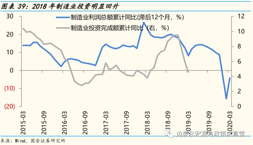 2016年和2017年利润明显改善叠加2018年利润维持高位,2018年制造业投资明显回升。此轮制造业投资回升滞后于利润改善大约两年时间,这是与传统经验不太一样的地方。随着大宗商品价格上涨,2016年制造业利润已经开始改善。2016年和2017年制造业利润分别为12.3%和18.2%,分别比各自前一年高出9.5和5.9个百分点。在2016年和2017年利润明显改善的情况的下,2018年制造业利润同比为8.7%,依然处在比较高的位置上。按照投资滞后利润大约1年的时间,2017年制造业投资理应回升,但是2017年钢铁、有色、水泥等传统制造业受到供给侧改革影响,投资受到压制,导致利润与投资的滞后期被拉长。