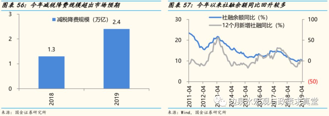 年初以来,无论是财政政策还是货币政策,均超出了市场预期。财政政策超预期主要体现在减税降费力度很大,对企业盈利形成支撑。财政政策超预期主要体现在减税降费的力度非常大,企业减税降费将达到2万亿,其中增值税减税将超过1万亿[2]。增值税减税的重点在于制造业企业,制造业企业增值税减税可能超过5000亿,这将会从两个方面改善企业盈利状况:一方面若制造业企业不降低产品含税价格,减税将会直接提升企业利润。另一方面若制造业企业降低产品含税价格,将有利于产品销售,间接支撑企业利润。2018年制造业企业利润总额为5.7万亿元,假定制造业增值税减税红利全部由制造业企业获得,制造业企业利润将会增加9%左右。另外,社保缴纳比例降低等降费措施也会对制造业企业利润带来积极影响。货币政策超预期主要体现在社融增速回升,对企业融资和需求形成支撑。货币政策超预期主要体现在宽信用政策带来社融增速明显回升。2019年4月社融余额同比为10.4%,比去年高出0.6个百分点。由于社融余额总量很大,0.6个百分点在感官上存在一种回升幅度不是很大的感觉。其实,社融回升的幅度是很大的,我们采用12个月新增社融同比来衡量。2019年4月的12个月新增社融余额同比为-0.3%,比2017年高出13.7个百分点,表明社融确实明显改善。社融余额同比回升,意味着企业可用资金增多,一方面信用扩张可以提升经济的整体需求,进而改善企业盈利环境;另一方面信用扩张,企业可能直接增加投资需求,进而对制造业投资形成支撑。