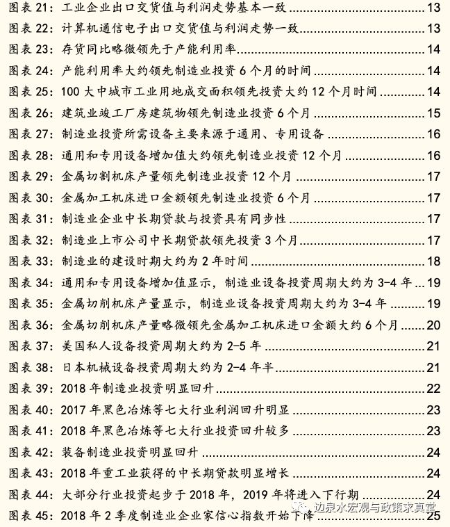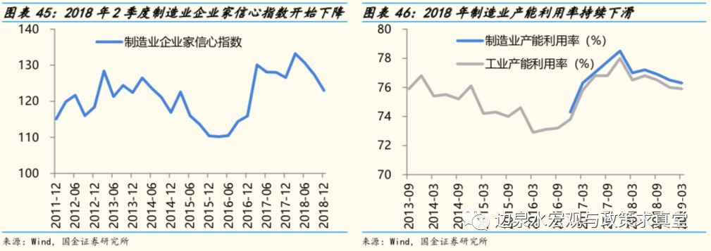 行业层面来看,2018年大部分行业经营状况转弱,包括利润总额同比下行,库存周期处于主动去库存和被动补库存阶段,产能利用率下滑,进一步验证制造业投资将会下行。从行业层面更进一步研究企业经营状况。国家统计局公布了31个制造业行业的利润数据,2018年22个行业的利润同比出现下滑,且11个行业下滑幅度超过10个百分点。国家统计局公布了18个行业的产能利用率的数据,2018年11个行业产能利用率下滑。很多行业的产能利用率是从2018年下半年才开始下滑的,14个行业2018年4季度的产能利用率低于2017年4季度。按照PPI同比与产成品存货同比的变化方向为标准,库存周期可以划分为四个阶段:一是主动补库存阶段,PPI同比和产成品存货同比同时上升。二是被动补库存阶段,PPI同比下滑,产成品存货同比上升。三是主动去库存阶段,PPI同比和产成品存货同比均下滑。四是被动去库存阶段,PPI同比上升,产成品存货同比下滑。同时公布PPI同比和产成品存货同比的行业为23个行业中,其中黑色冶炼等9个行业已经步入主动去库存阶段,6个行业步入被动补库存阶段,表明大部分行业逐渐步入库存周期的下行期。大部分行业利润总额同比、产能利用率下滑,并处于被动去库存阶段,进一步验证制造业投资将会下行。