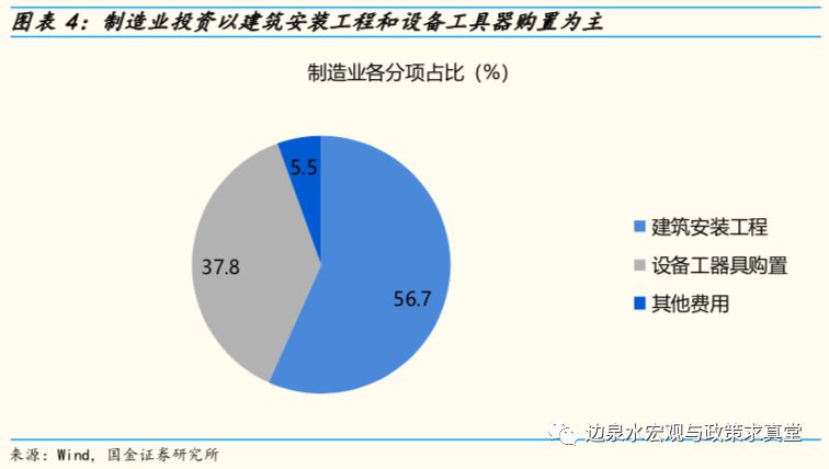 制造业投资主要涉及建设厂房、购置设备等,因此建筑安装工程和设备工具器具购置占据制造业投资绝大部分。制造业投资涉及购置厂房、建设厂房、购置设备、安装设备等。以国家统计局划分标准来看,制造业投资包括建筑安装工程、设备工具器具购置及其他费用。建筑安装工程包括建筑工程和安装工程,其中建筑工程主要是指各种房屋、建筑物的建造工程,安装工程是指各种设备、装置的安装工程。设备工具器具购置是指报告期内购置或自制的,达到固定资产标准的设备、工具、器具的价值。其他费用是指在固定资产建造和购置过程中发生的,除建筑安装工程和设备、工器具购置投资完成额以外的应当分摊计入固定资产投资的费用,不指经营中财务上的其他费用[1]。制造业投资中建筑安装工程和设备工具器具购置占据绝大部分。以2017年为例,建筑安装工程、设备工具器具购置和其他费用占比分别为56.7%、37.8%和5.5%。