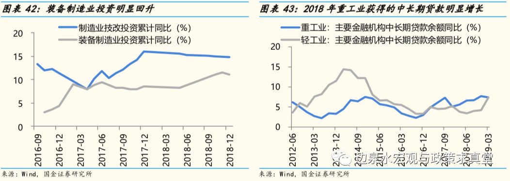 本轮制造业投资最大的特点在于传统制造业产业结构升级,技改投资增加,推动制造业投资增速上升。石油加工、化学原料、非金属制品、黑色冶炼、有色冶炼等都属于高污染及产能过剩行业,受供给侧改革影响,扩充产能受到制约。这些行业投资之所以会出现明显回升,主要是因为产业结构升级,需要更新设备,置换产能,或者应对环保要求等。其实,随着制造业利润改善,从2017年开始制造业企业技术改造便逐渐增加。2017年制造业技改投资占制造业投资的比重为48.5%。2018年制造业技改投资增速为14.9%,高出制造业投资增速5.4个百分点,制造业技改投资不仅占比高,且增速快,成为制造业投资回升的重要推动力。不仅如此,技改投资增加拉动了通用和专用等装备制造业投资上升。2018年装备制造业投资增长11.1%,增速比全部制造业投资高1.6个百分点。与此相印证的是,2018年主要金融机构对重工业的中长期贷款余额同比为7.7%,达到2012年以来的最高水平,表明金融机构对传统制造业技改投资的支持力度是很大的。然而,主要金融机构对轻工业的中长期贷款余额同比为4.2%,依然处于偏低的水平,与轻工业投资并未出现明显回升相对应。