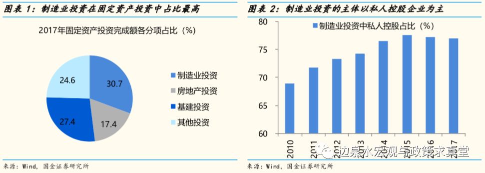 与房地产和基建投资相比,制造业投资市场化程度最高。投资是我国经济增长的重要动力,主要包括制造业、房地产和基建投资。2017年制造业、房地产和基建投资占固定资产投资完成额的比重分别为30.7%、17.4%和27.4%。三类投资均有不同的属性,房地产投资对利率、房地产政策敏感度非常高,基建投资属于逆周期调节工具,制造业投资的市场化程度较高。制造业投资的市场化程度之所以较高是因为绝大部分制造业投资来自于私人控股企业。以2017年为例,制造业投资结构中,私人控股企业占比达到77.0%。私人企业往往根据市场环境变化,例如需求状况、未来盈利预期等,独立做出投资决定,较少地受到政府的直接干预,市场化程度显著高于房地产投资以及基建投资。