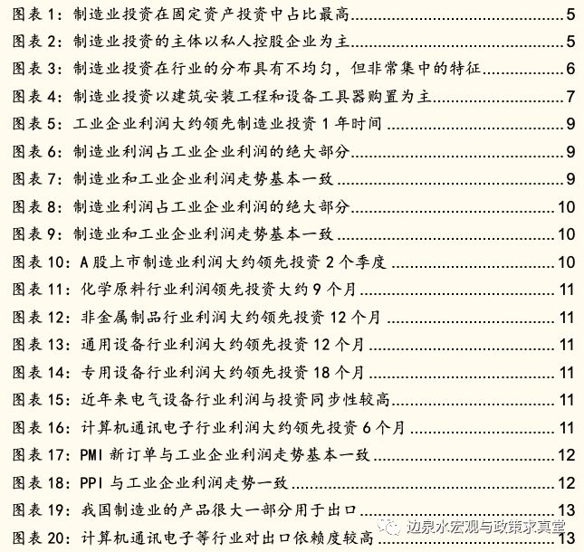 利润改善不仅意味着投资回报增加,也意味着可用资金的增加,利润是判断制造业投资趋势的核心因素,领先于投资。为了扩充产能或者进行产业结构升级,制造业企业需要投资。无论哪种投资方式,投资的目的都在于期望在未来一段时间获得回报,也就是未来收益。然而,未来收益是不可预测的,企业往往通过当期的盈利状况线性外推未来的盈利状况,利润是当期盈利状况最好的衡量指标。此外,投资涉及到大量资金的使用。我国很多企业投资的资金来源于内源融资,即通过利润留存的方式获得。即便企业可以从外部获得资金,盈利状况对其获取资金的能力的影响也非常大。利润改善不仅可以增加内源融资的资金来源,也可以增强从外部获取资金的能力。由此可见,利润改善不仅意味着投资回报增加,也意味着资金约束减弱,利润是制造业投资的核心逻辑。值得注意的是,从利润改善,到企业决策,再到投资落地,包括购置土地、购置设备、建设厂房等,需要经历一段时间。利润改善与投资回升之间存在一定的时间差,也就意味着利润是制造业投资的先行指标。我们将从工业企业、制造业上市公司以及制造业行业三个层面详细分析利润与投资之间的关系。