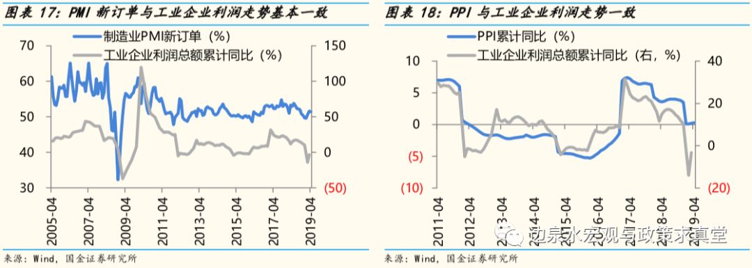 制造业PMI新订单指数及PPI是追踪国内外制造业需求的较好指标。制造业投资最直观的逻辑就是,当需求上升,若产能跟不上,企业就需要扩充产能。制造业PMI中新订单指数可以有效地代表制造业的国内外需求状况。原因在于新订单指数中不仅包括国内订单,还包括国外订单。从历史数据来看,制造业PMI新订单指数略微领先于工业企业利润累计同比。此外,PPI也是跟踪国内外需求的较好指标。我们在《中国PPI下行,全球央行逐渐进入降息通道——中国PPI对我国与全球经济和政策信号作用的分析》的专题报告中提出,PPI是我国和全球经济的敏感指标,对经济及需求变化具有信号作用。从历史数据来看,PPI与工业企业利润累计同比具有同步性。