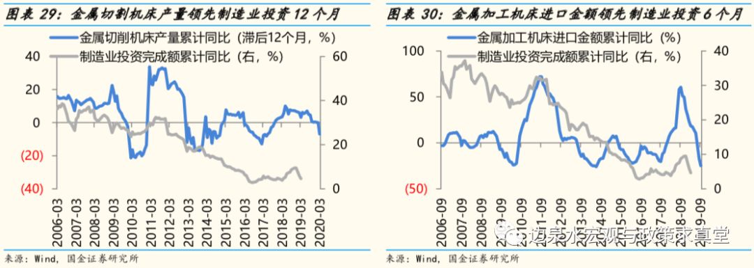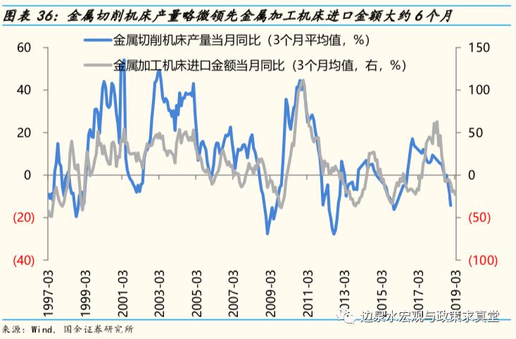 金属切割机床是通用设备行业的典型设备,其产量累计同比大约领先制造业投资12个月。金属切削机床属于典型的通用设备,原因在于大部分需要进行金属加工的企业都需要用到金属切割机床,是设备投资中广泛使用的设备。从历史数据来看,金属切割机床累计同比大约领先制造业投资12个月。此外,由于部分行业或者企业对机床的精度和稳定性要求较高,此类高端机床需要从日本、德国等国家进口,金属加工机床进口金额对设备投资需求也很具有代表性。从历史数据来看,金属加工机床进口金额累计同比大约领先制造业投资6个月(金属切割机床产量和金属加工机床进口金额对制造业投资领先时间不一致的原因在于从海外订购到进口之间存在时间差,这一点将在后文介绍)。