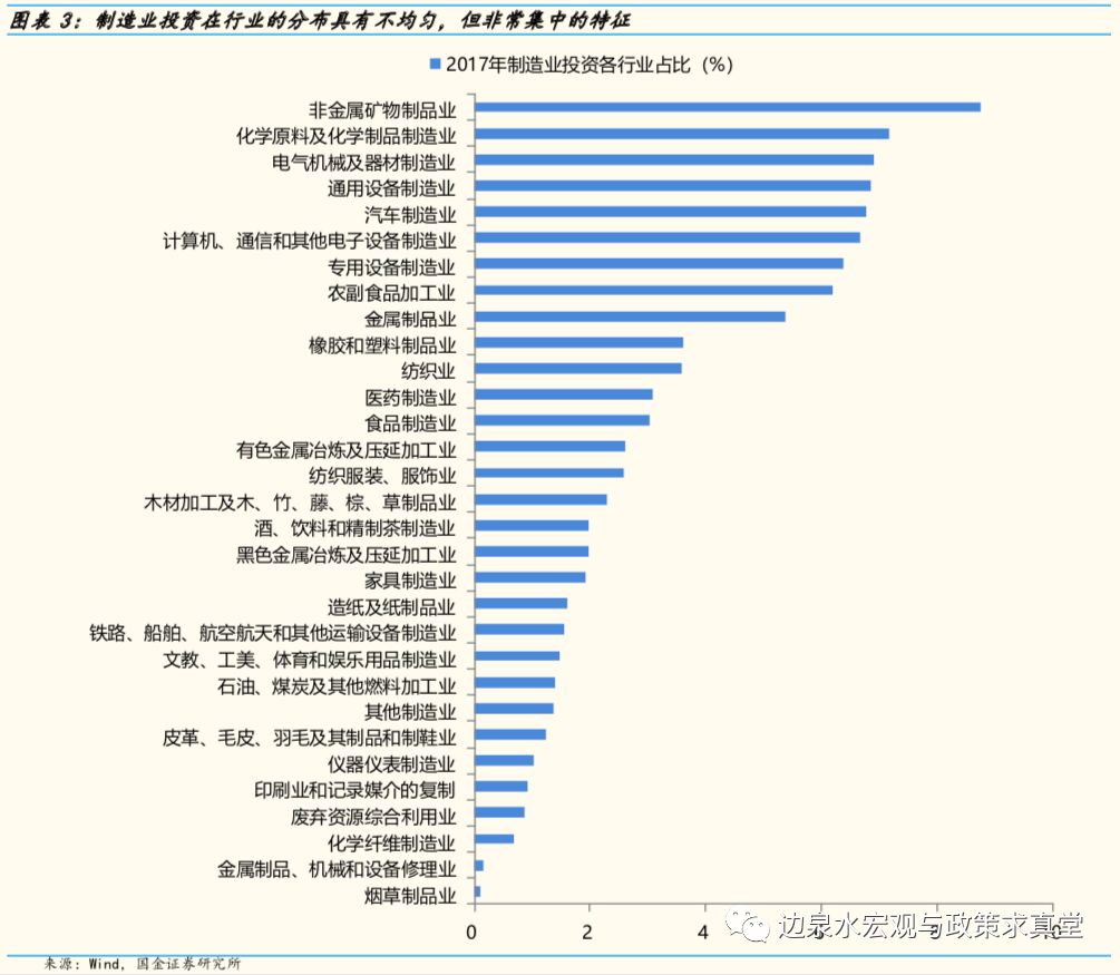 制造业行业众多,投资分布不均匀、且集中度高。制造业指的是对采掘品、农副食品等进行加工、再加工的物质生产部门,它并不是一个单独的行业,而是很多行业的统称。国家统计局按月度、年度公布制造业相关行业的投资数据。从公布的投资数据来看,制造业共计包含31个行业,包括农副食品加工业、黑色金属冶炼及压延加工业等。我们熟知的水泥、钢铁、挖掘机等分别隶属于非金属矿物制品业、黑色金属冶炼及压延加工业、通用设备制造业。由于国内外对各行业产品的需求量不一样,制造业投资在各行业的分布呈现两个特征:一是分布不均匀,行业之间差异较大。以2017年为例,非金属矿物制品业占制造业投资的比重最高,为8.8%,烟草制品业占制造业投资最低,为0.1%,两个行业的占比差异大。二是大部分投资集中于少部分行业。以2017年为例,占比排名前五的制造业分别为非金属矿物制品业、化学原料及化学制品制造业、电气机械及器材制造业、通用设备制造业、汽车制造业,合计占比达到36.4%。排名前十行业的占比合计达到64.7%。