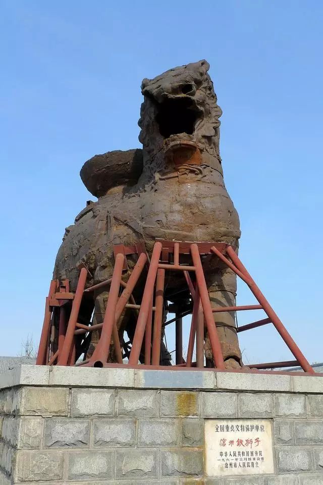 4、沧州铁狮子:又称“镇海吼”,位于沧州市东南郊,铸成于后周广顺三年(953年),身长6.264米,体宽2.981米,通高5.47米,重约32吨。沧州铁狮子与定州开元寺塔、正定隆兴寺铜菩萨像,并称为“河北三宝”。