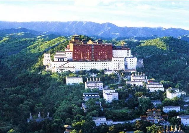 18、普陀宗乘之庙:位于承德市避暑山庄北,为承德外八庙中规模最宏大者,建于清朝乾隆三十六年(1771年),是乾隆皇帝为了庆祝他本人60寿辰和他母亲皇太后80寿辰而下旨仿西藏布达拉宫而建。其主体建筑位于山巅,60余座(现存40余座)平顶碉房式白台和梵塔白台随山势呈纵深式自由布局,无明显轴线。