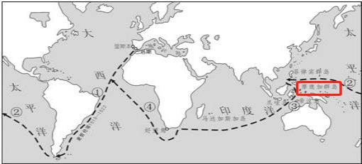 ▲麦哲伦环球航线图,红色部分为葡萄牙势力范围香料群岛