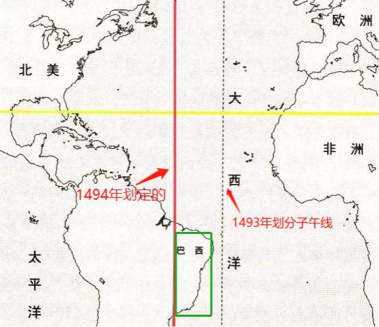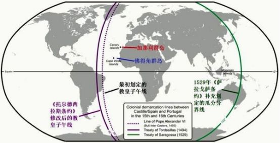 ▲教皇子午线的两次划分,虚线部分为第一次划分,红色实线部分为1494年第二次划分。这次最终达成协议