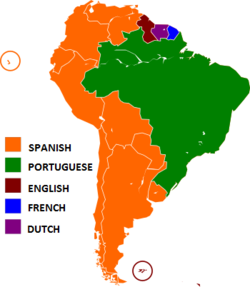▲拉丁美洲国家的语言分布图,橙色为西班牙语,绿色为葡萄牙语,蓝色为法语,紫色为荷兰语,红色为英语
