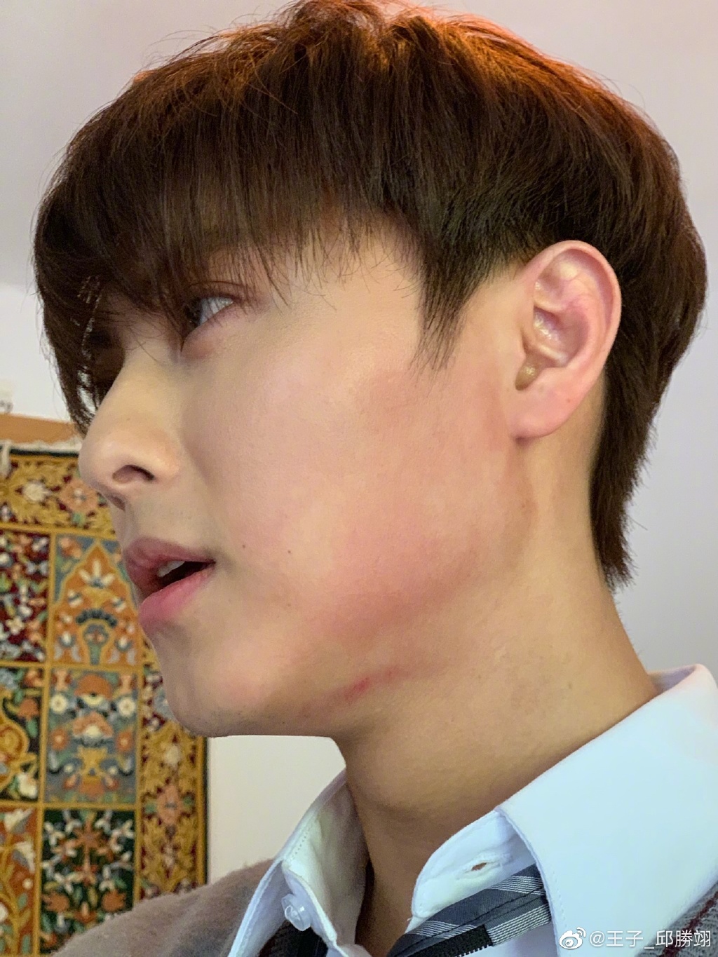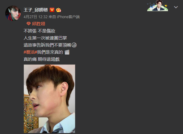 第二位小编要提一下偶像出身的王子邱胜翊。大家对他的印象一定是唱跳俱佳的爱豆组合棒棒堂的王子吧。殊不知王子自出道以来拍过不少影视剧了,既有偶像剧又有抗战剧,可谓是勇于突破自我。而且拍戏还是拼命三郎,挨打的戏也是毫不含糊真打!王子坦言“不夸张、不是伤妆,人生第一次被连赏巴掌,这故事吿诉我们不要顶嘴”