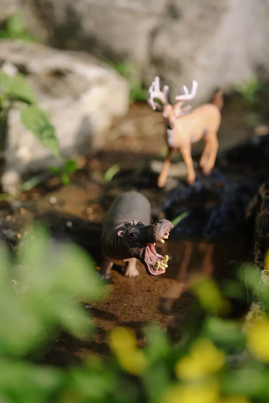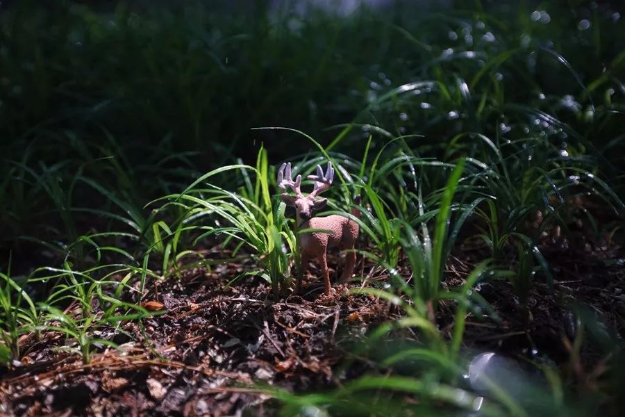 拍摄角度很大程度上决定了照片的成败,太高或者太低的拍摄角度都会让照片看起来有些别扭。经过多次尝试,拍摄角度基本和鹿模型平行是最理想的,最有临场感。