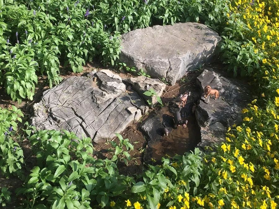 第二个场景选择在公园中几块错落的石头堆中,在缝隙中倒入了一瓶矿泉水,利用石块的错落感,寻找山中湖泊旁一群动物在喝水、嬉闹的场景。